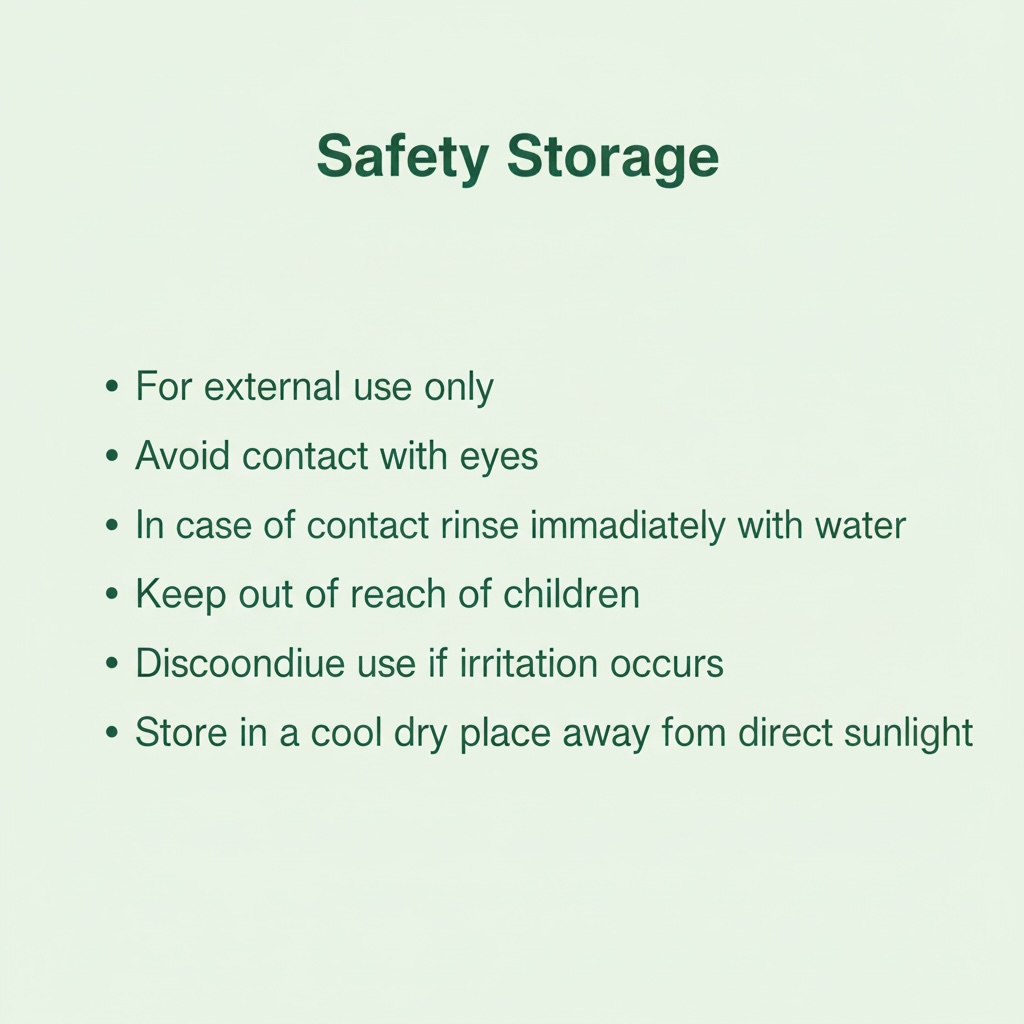 Safety : For external use only. Avoid contact with eyes. In case of contact, rinse immediately with water. Keep out of reach of children. Discontinue use if irritation occurs.